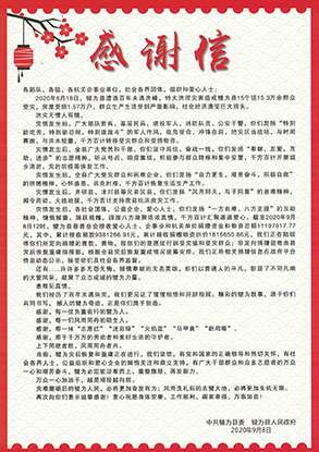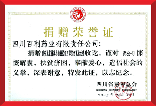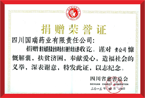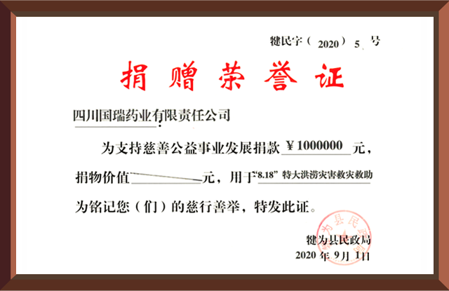 2020年8月18日,四川省犍为县遭遇百年未遇特大洪涝灾害,苏州涛声应用软件定制开发有限公司集团国瑞药业向犍为县灾区捐赠现金100万元。